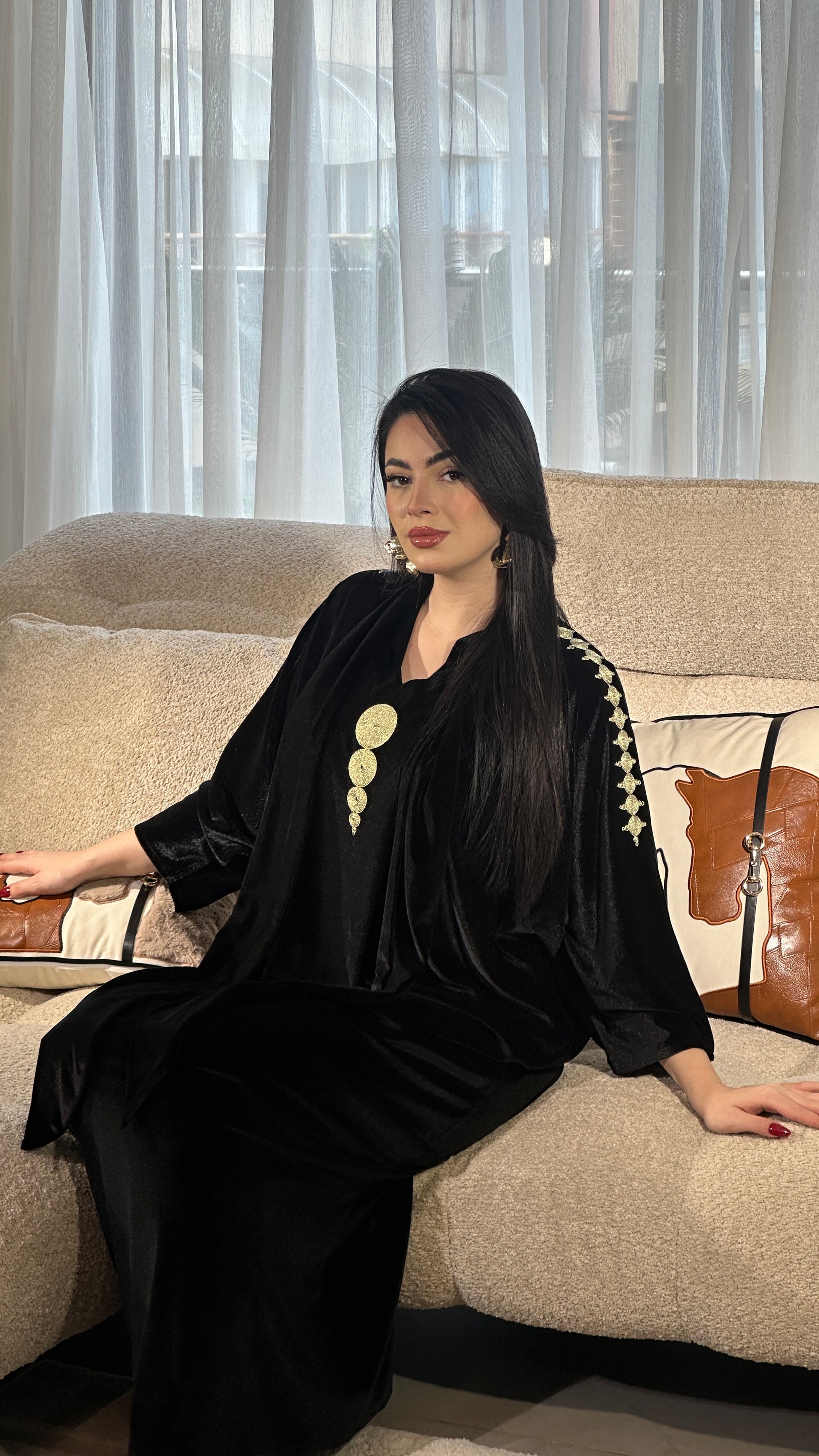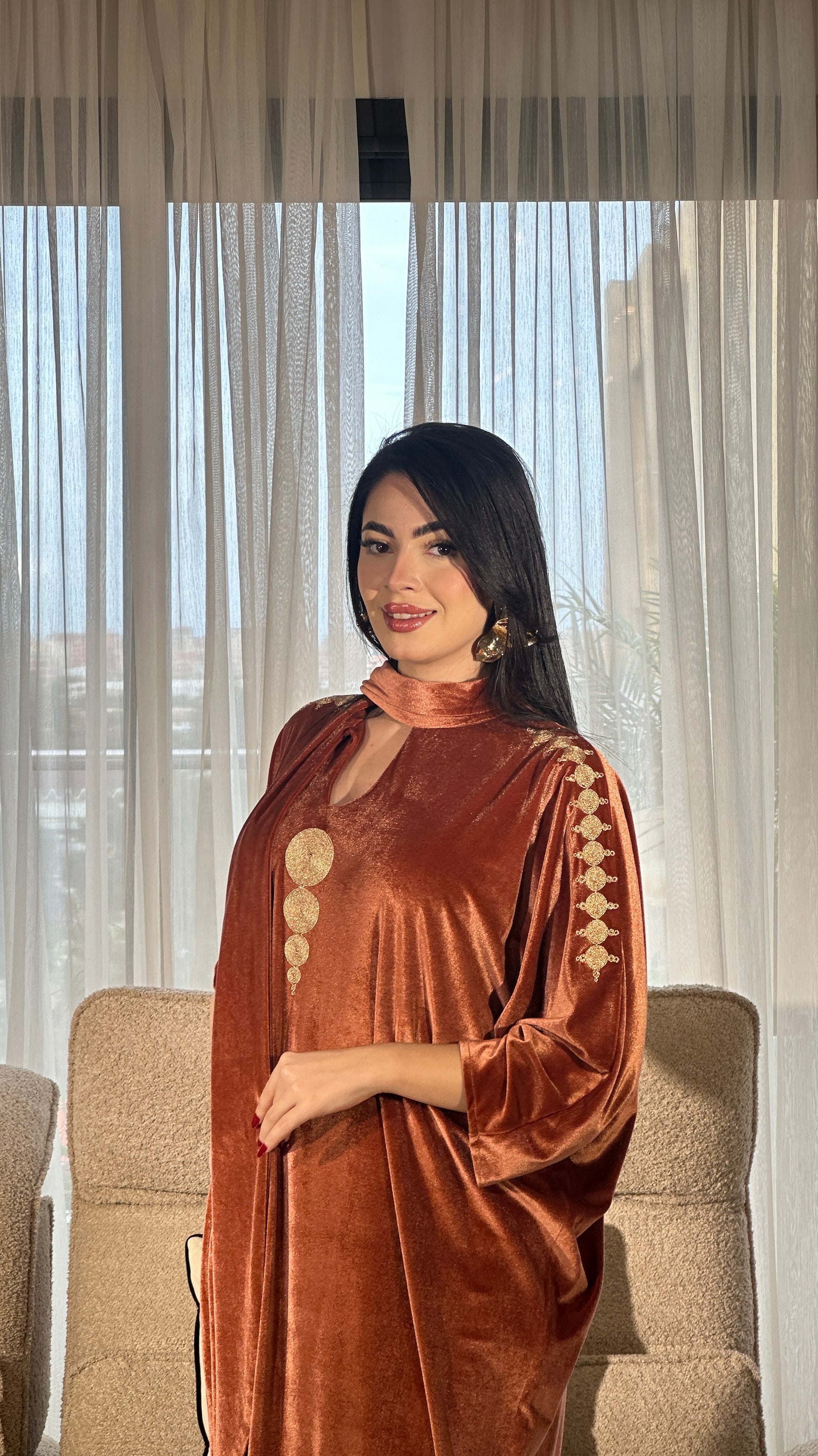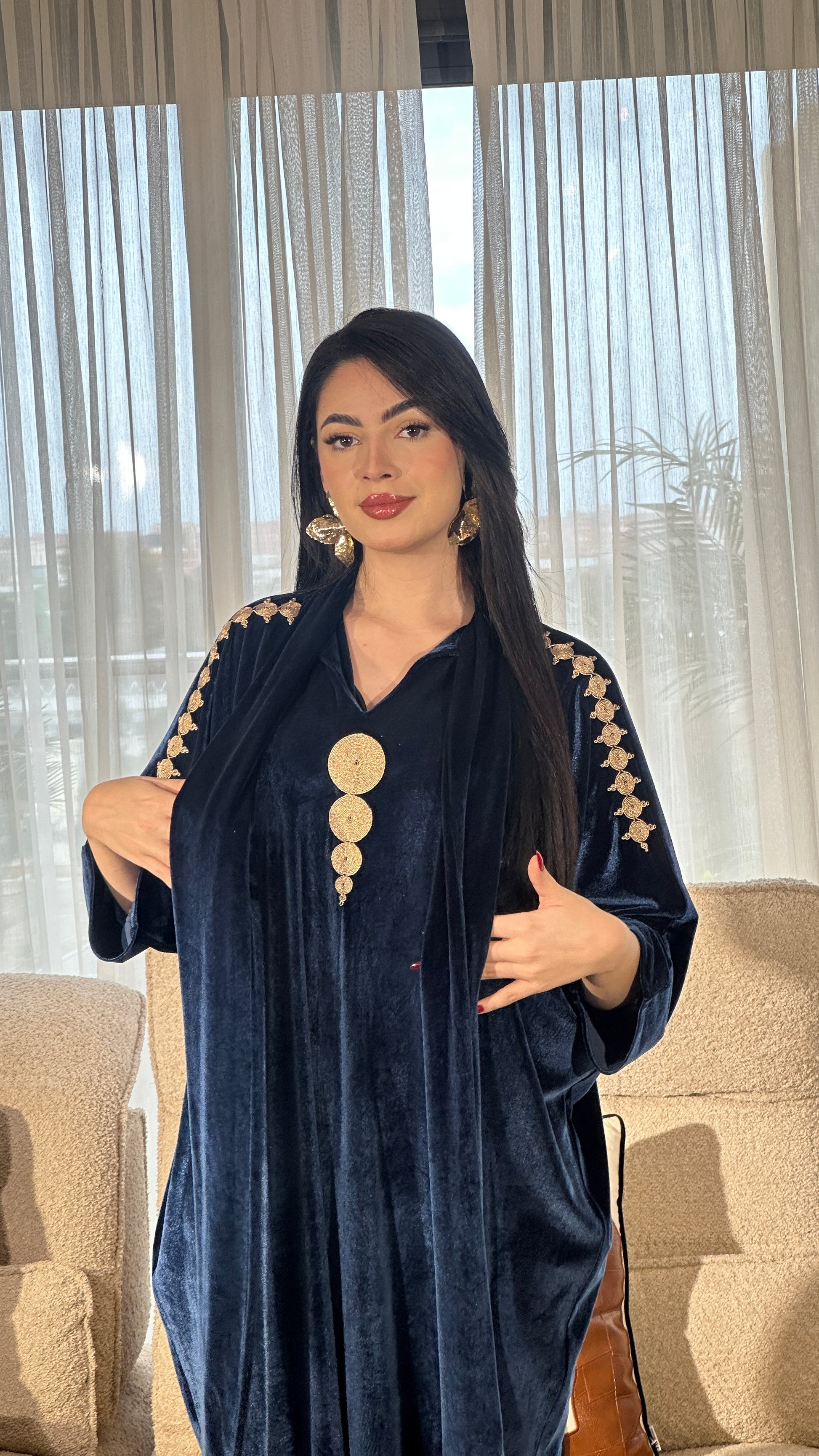 قطعة مصنوعة من قماش فاخر مزخرف بنقوش هندسية دقيقة بخيوط ذهبية لامعة، تعكس فخامة وأناقة راقية. القماش يتميز بثقل خفيف ولمعة ناعمة تعطي حضورًا قويًا دون مبالغة. الأكمام الواسعة بتصميم انسيابي تضيف لمسة عصرية راقية مع الحفاظ على الطابع الشرقي الأصيل. اختيار مثالي للمناسبات الخاصة والسهرات الراقية.