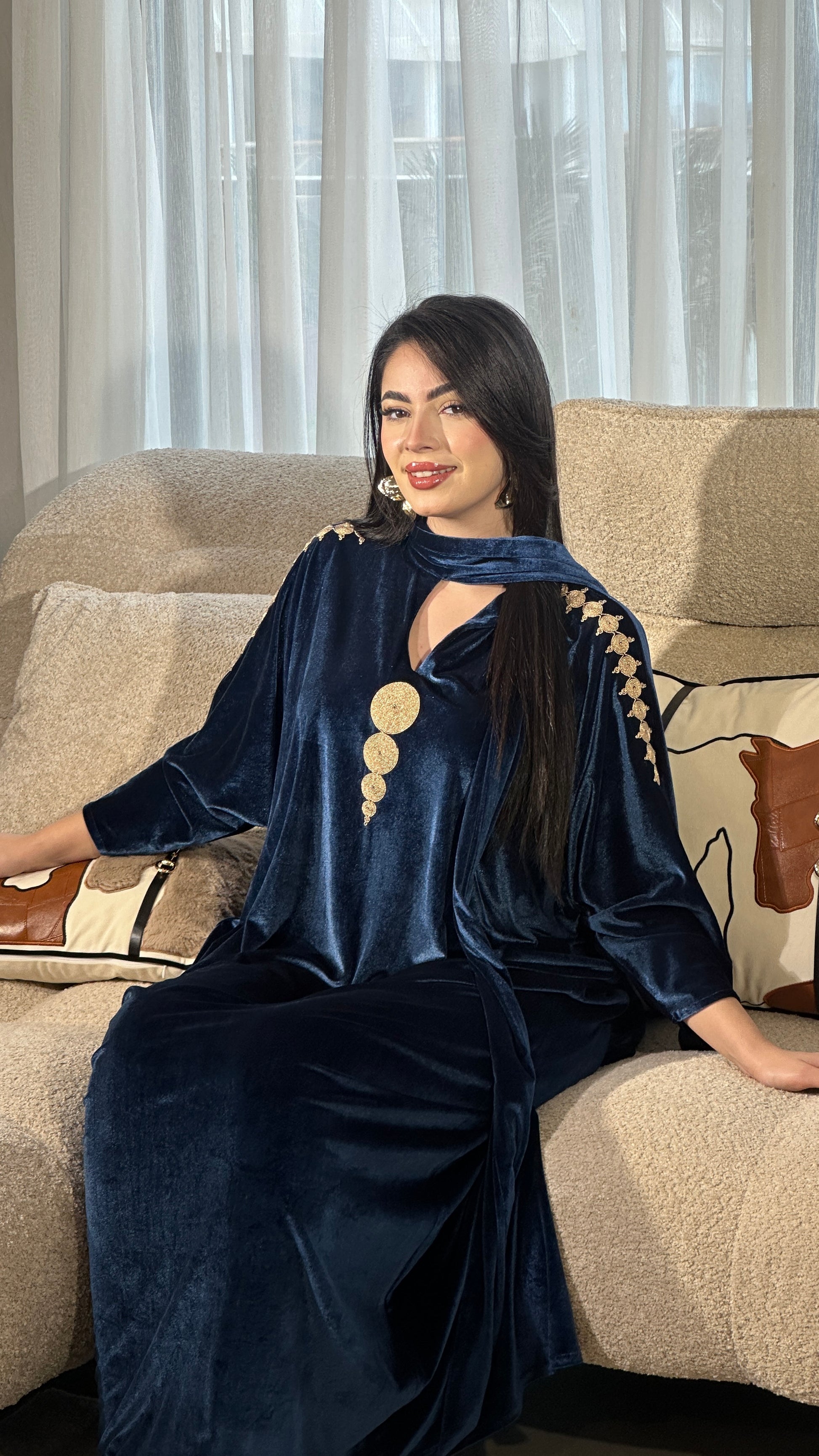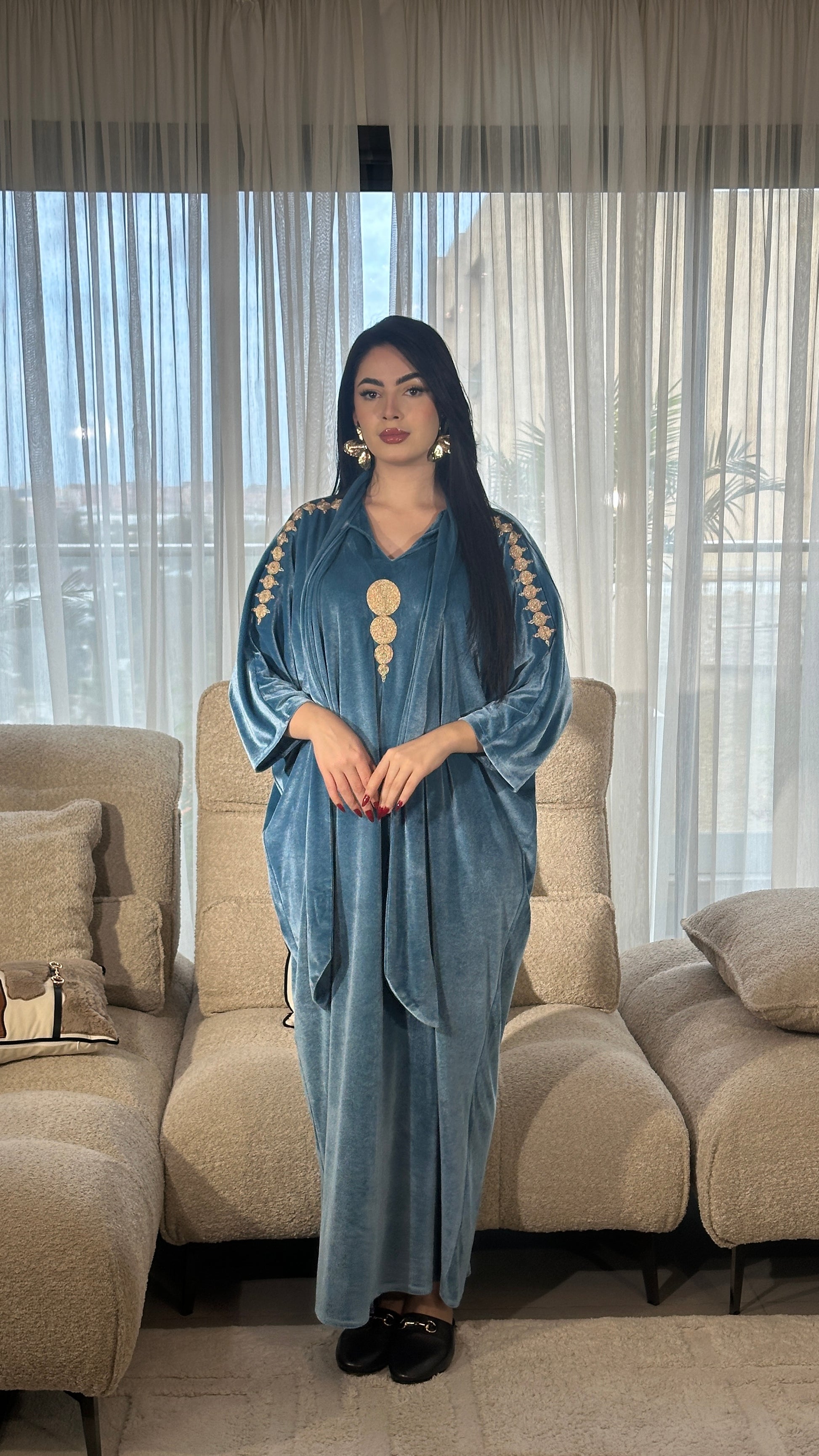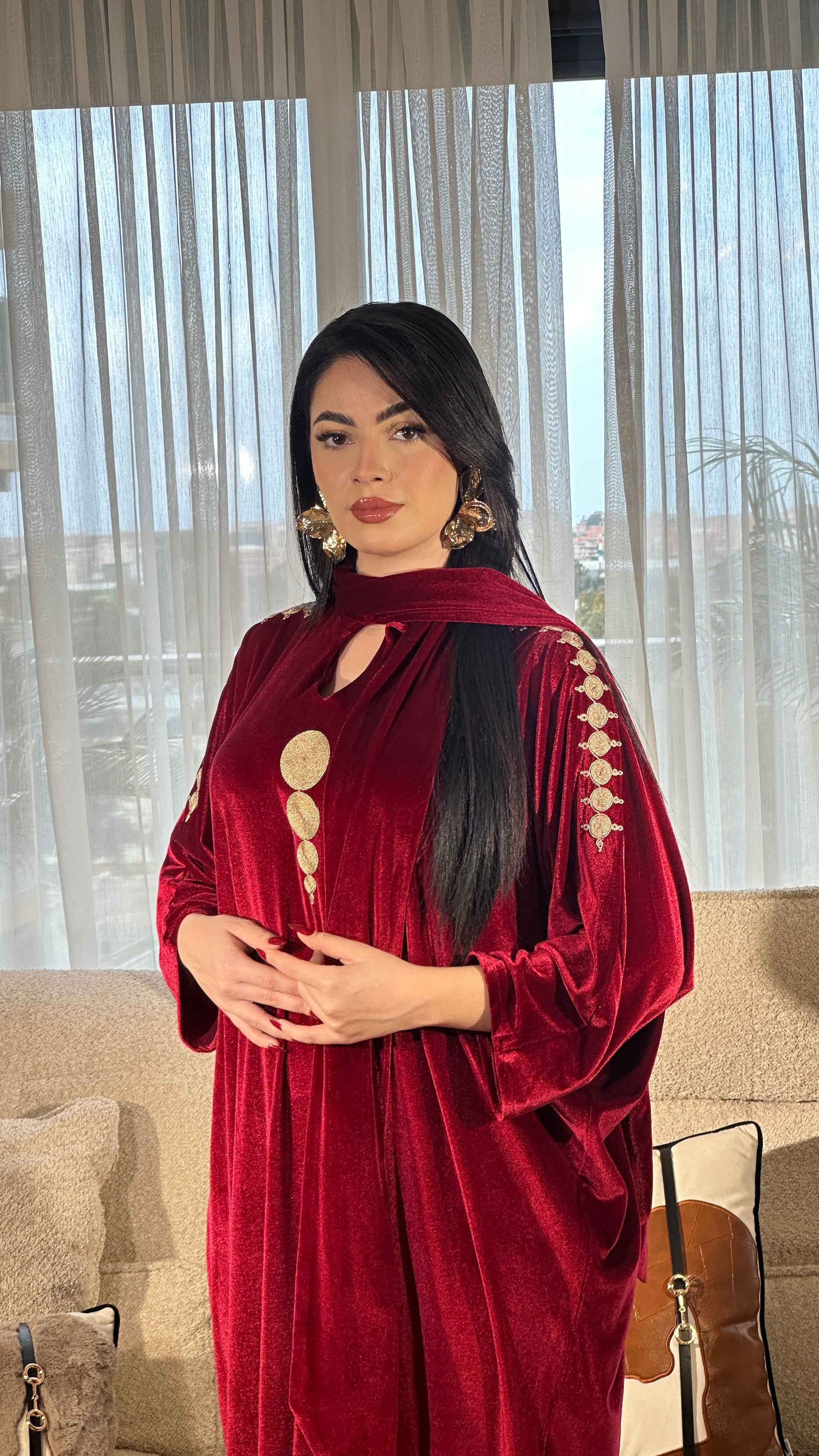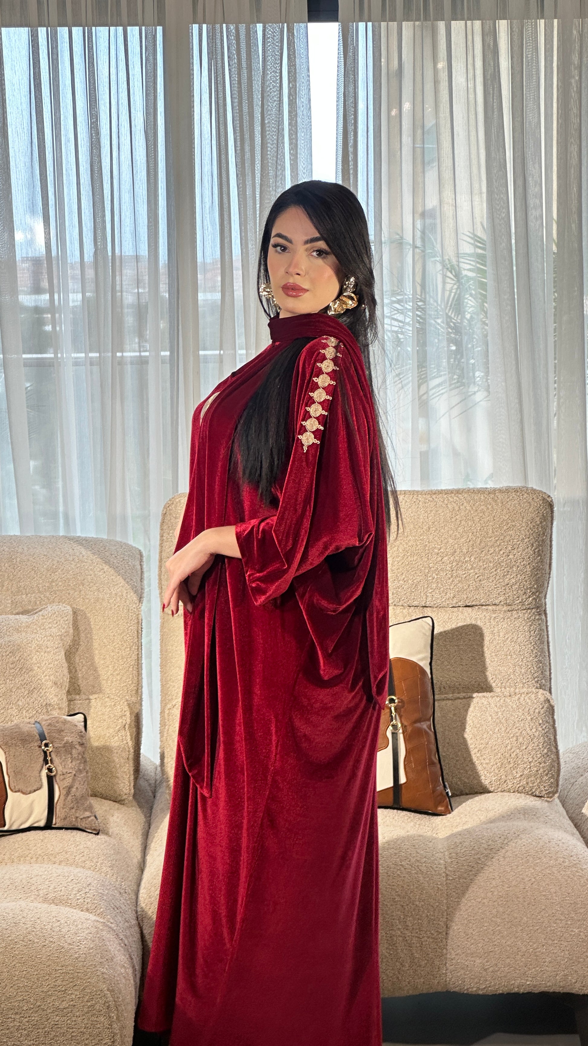 قطعة مصنوعة من قماش فاخر مزخرف بنقوش هندسية دقيقة بخيوط ذهبية لامعة، تعكس فخامة وأناقة راقية. القماش يتميز بثقل خفيف ولمعة ناعمة تعطي حضورًا قويًا دون مبالغة. الأكمام الواسعة بتصميم انسيابي تضيف لمسة عصرية راقية مع الحفاظ على الطابع الشرقي الأصيل. اختيار مثالي للمناسبات الخاصة والسهرات الراقية.